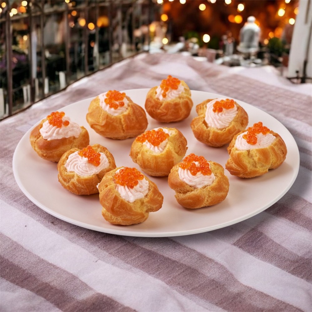 Состав: профитроли, сливочный сыр, мус из слабосолёной семги, красная икра.