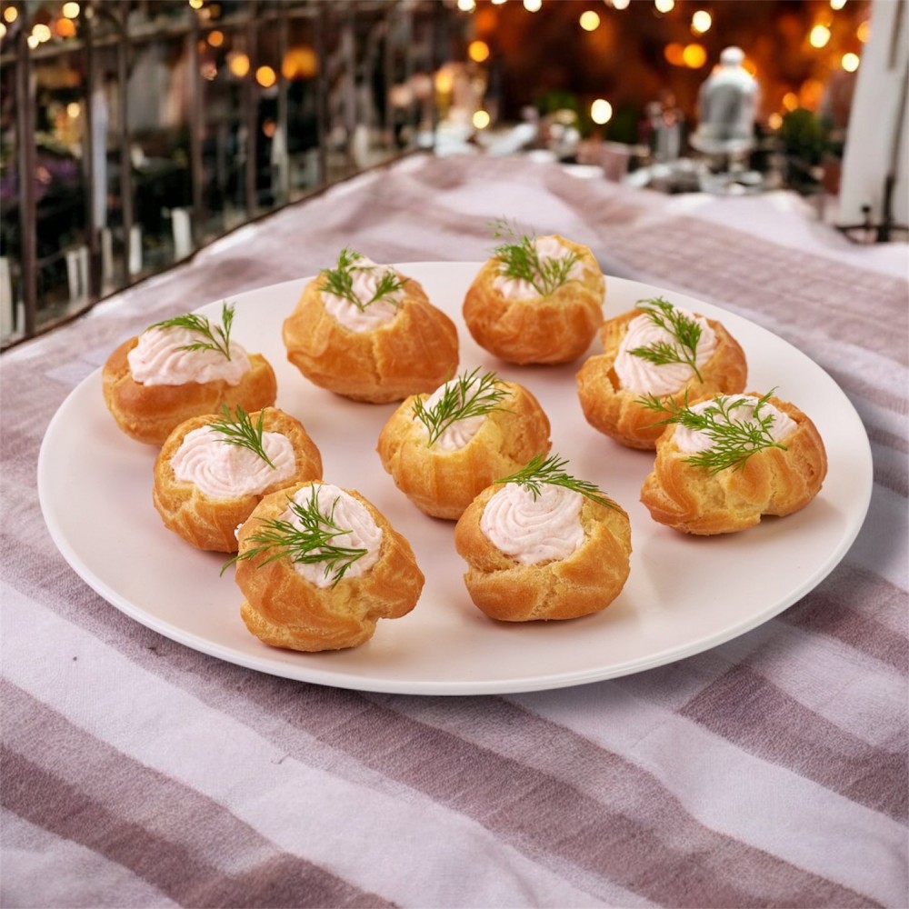 Состав: профитроли, крем-сыр "Филадельфия", зелень.